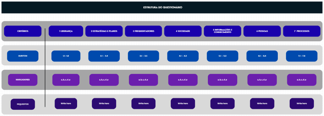 A estruturação dos critérios de avaliação, que perpassam do critério 1 ao 7, constitui-se elemento de fundamental importância e exige compreensão detalhada. A familiaridade com esta estrutura é premissa para a condução da análise e atribuição de pontuação de forma objetiva e consistente. Afigura 1, apresenta, de forma simplificada a estrutura do questionário de autoavaliação. Uma vez que seja considerada a aplicação deste material, a igreja estará não apenas mais alinhada à sua visão e missão, mas também mais preparada para gerar impacto ainda maior na comunidade e na sociedade. Dessa forma, este guia de referência tem como objetivo precípuo proporcionar às lideranças eclesiásticas instrumento eficaz para diagnosticar o nível de gestão de sua comunidade de fé. Assim, por meio de autoavaliação criteriosa, embasada em sólidos fundamentos acadêmicos, o guia visa conduzir as organizações religiosas a níveis elevados de maturidade em seus processos decisórios. Observa-se que a relevância deste material se estende, portanto, a todos que anseiam por aprimorar a gestão de suas igrejas e organizações, buscando maturidade decisória e impulsionando desenvolvimento sustentável e alinhado à missão transcendental de sua comunidade de fé.